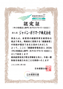 ジャパンポリマーク株式会社は、このたび「健康経営優良法人2026(中小規模法人部門 ネクストブライト1000)」に認定されました。